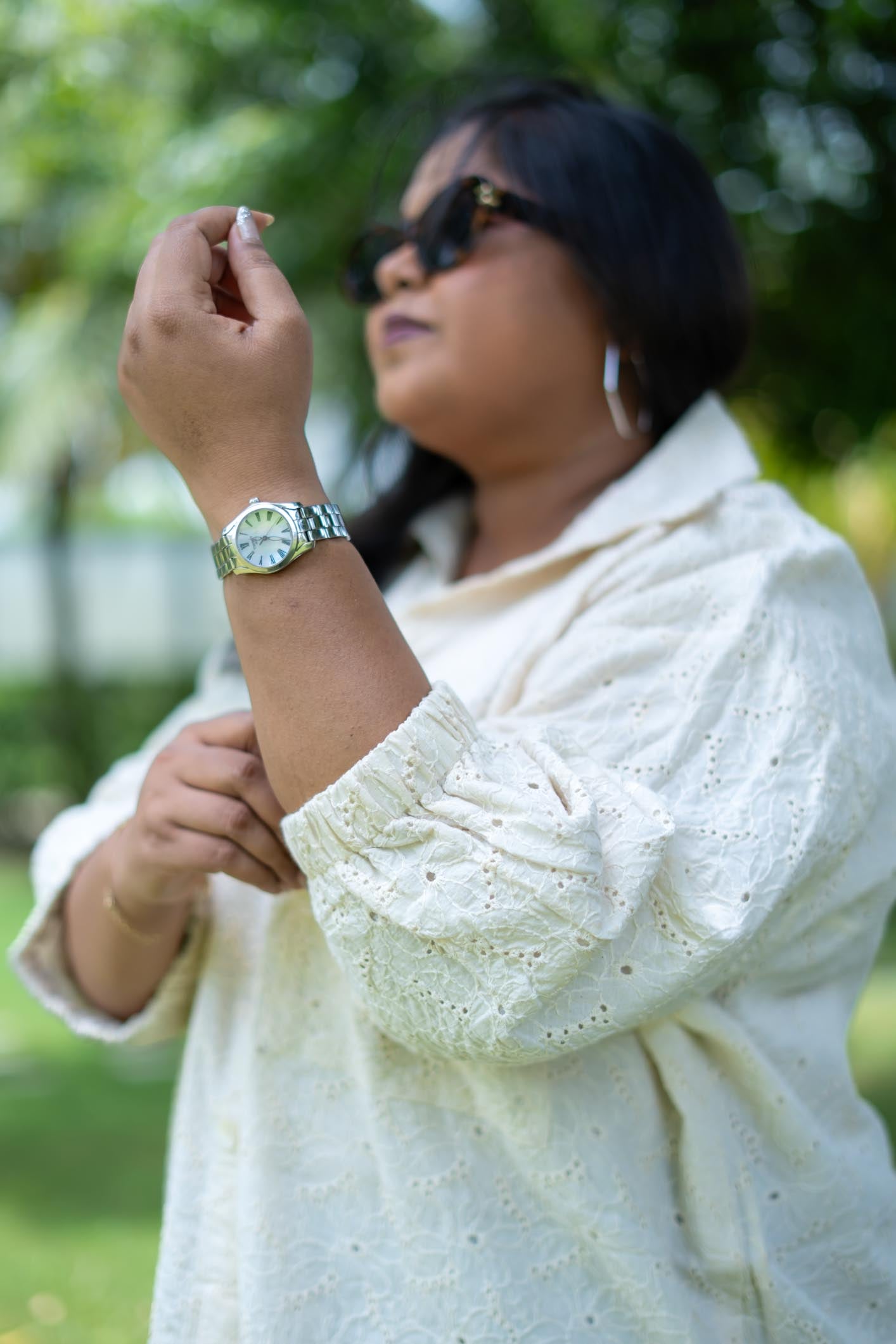 Made to breathe, made to balance: The Ivory Drift Button-down Dress is your quiet clarity in motion. With its collared neckline, button-down front, and long sleeves, this piece blends structure with softness. The off-white hue feels like stillness, grounded, luminous, and endlessly wearable. Whether layered or worn solo, it’s a silhouette that speaks in calm confidence.